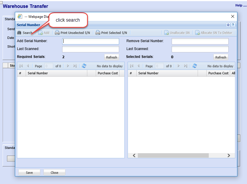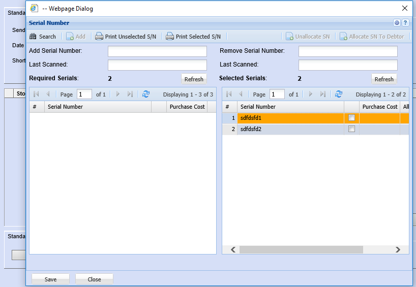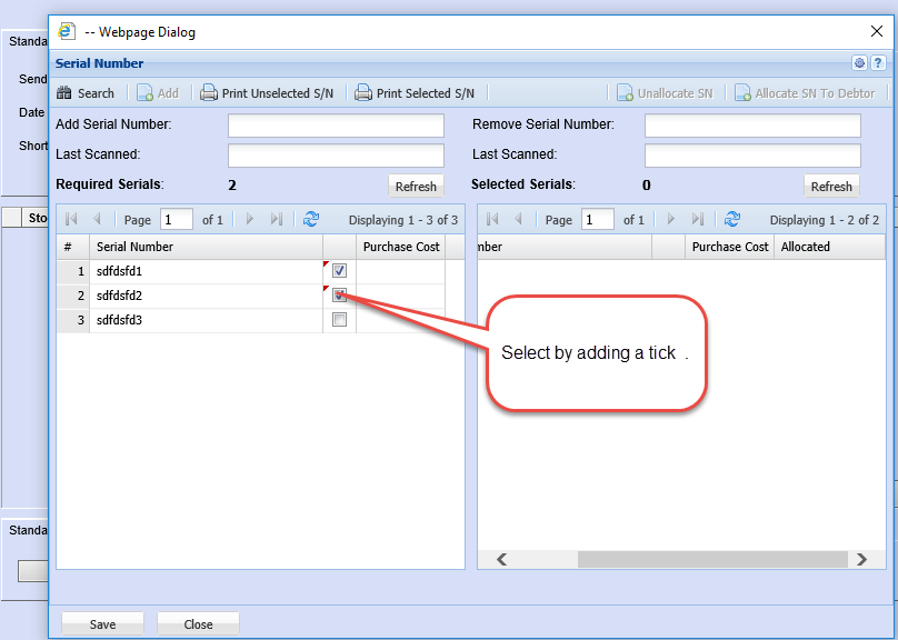 Save moves the serial numbers from required box to Selected, refresh box if necessary the selected number should correspond with the required serials number.