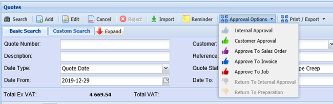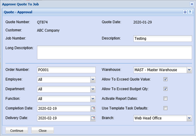 This example we are skipping the quote approval stages and approving the quote straight to job.
