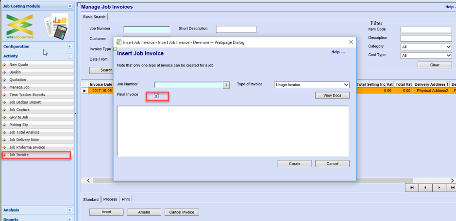 Once final invoice tick is added and the invoice processed, it will create an invoice and close the Job.