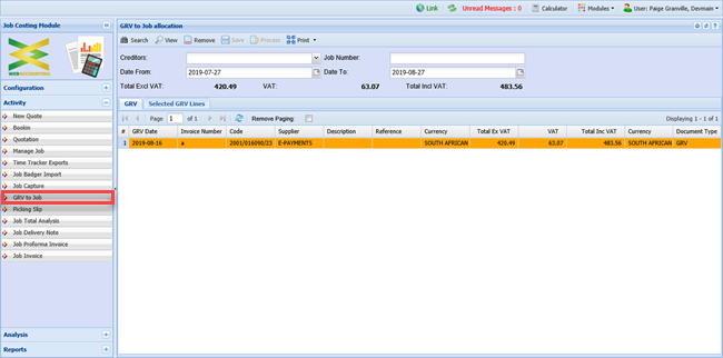 This shows the GRV’s that have been allocated to certain jobs and the jobs have been selected when preparing the GRV on creditor’s module.
