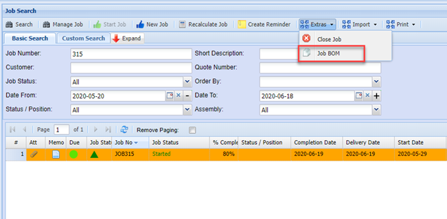 Search for the job, click the Extras dropdown and click the Job BOM Button.