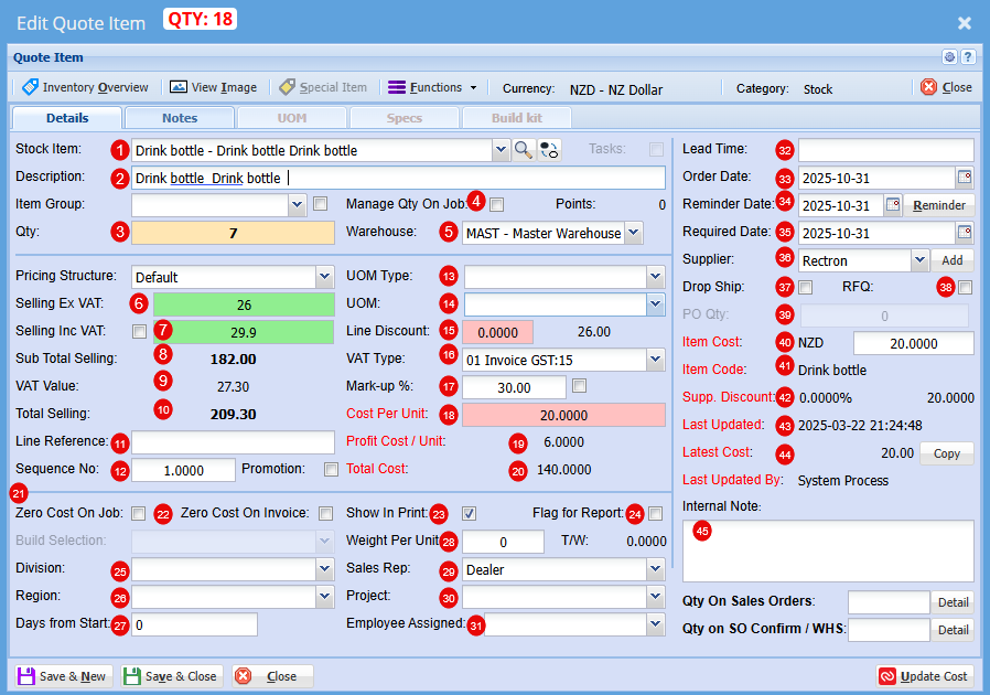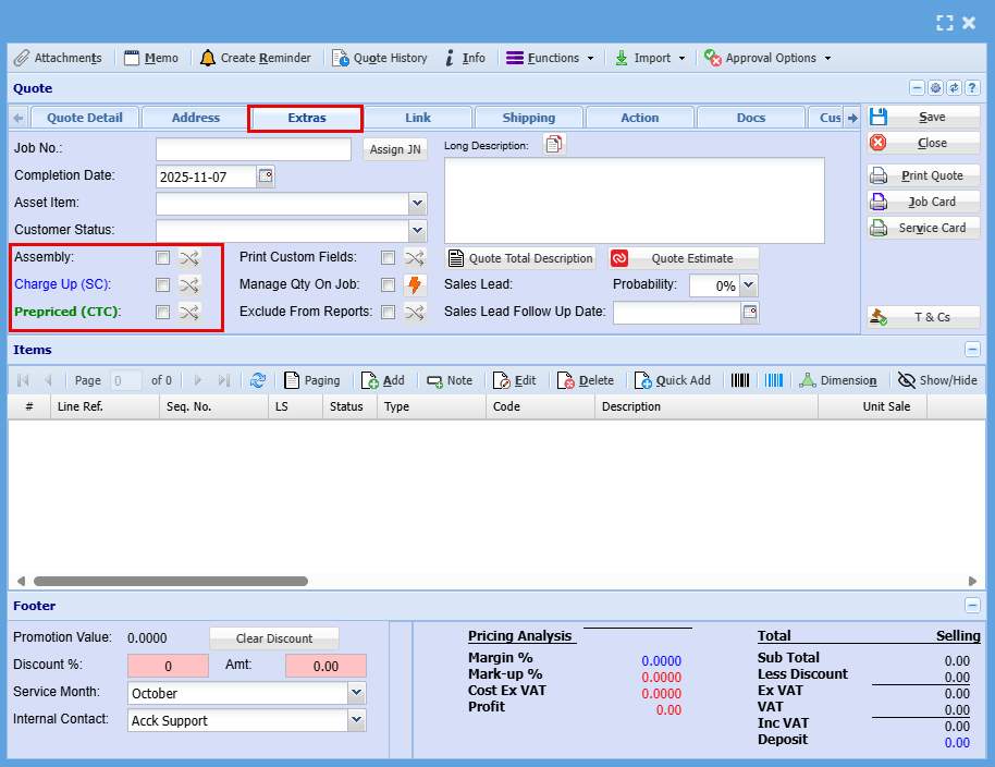 These ticks will be automatically on or off based on the setup if the item. When the item is promoted to a Job, its initial cost is cleared and recalculated progressively as the job is built—ensuring you have an accurate final cost at completion. |