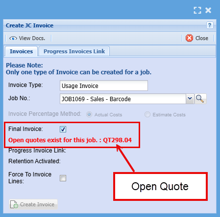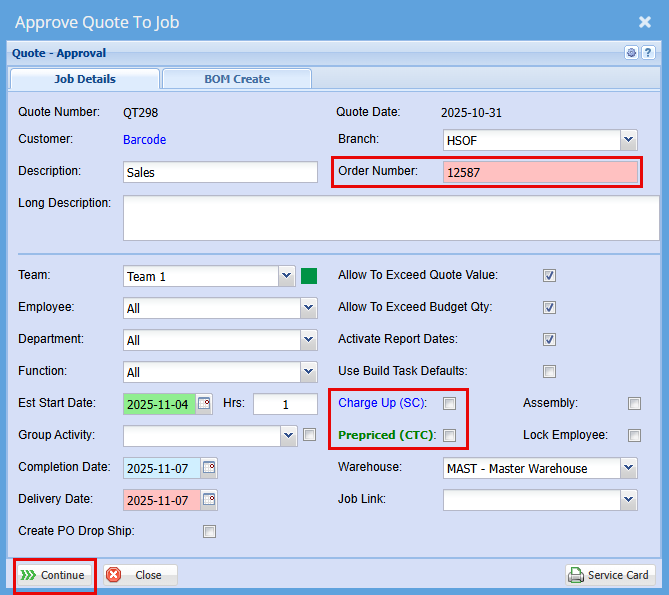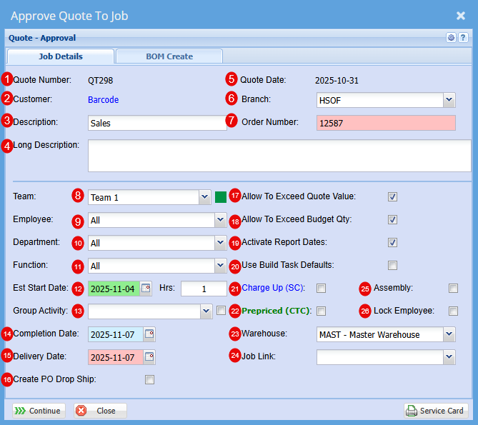 Once you click Approve to Job you will have the below Approve Quote to Job screen pop us.