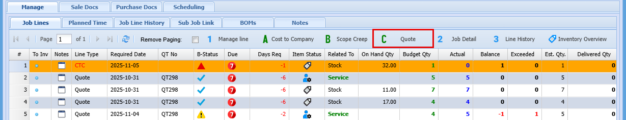 | Line Type | This refers to where the line came from, the example above is from a Quote but can come from a CTC (Cost to Company) or a SC (Scope Creep) |