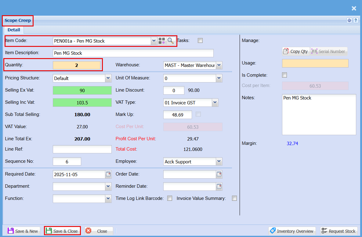 6 Check Sell Price - click Save & Close to confirm your choice