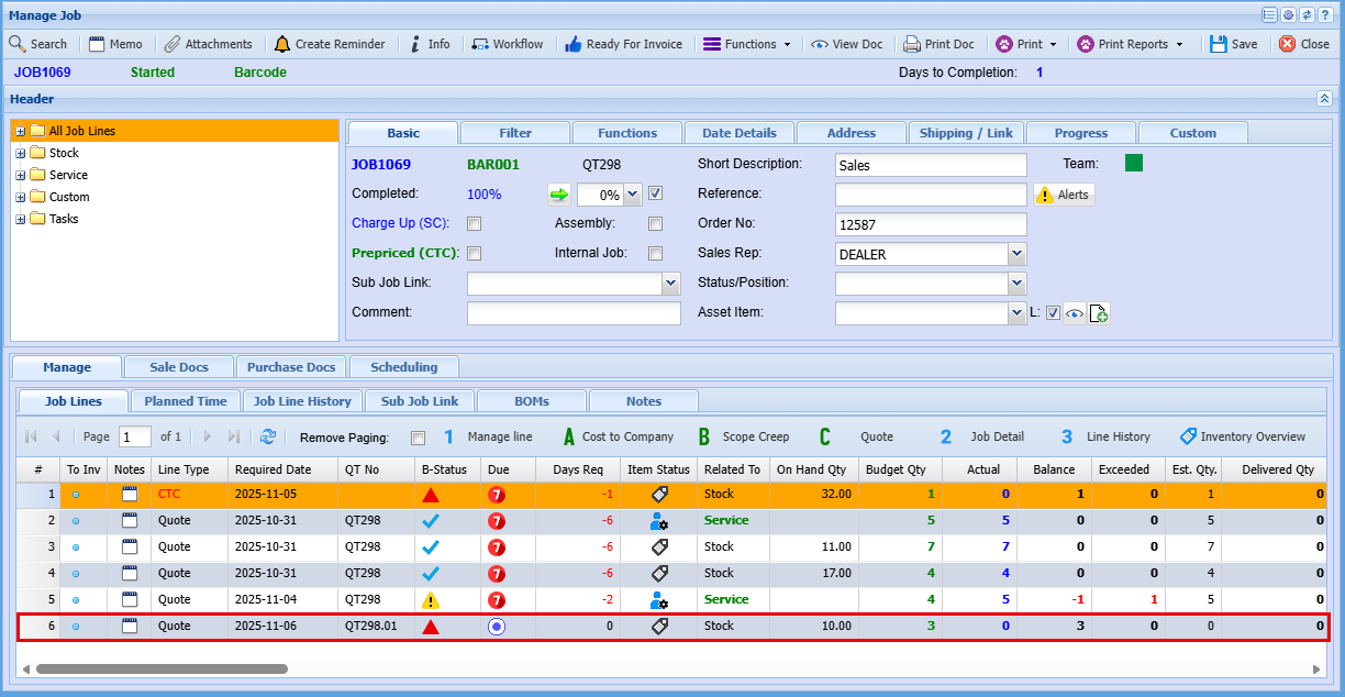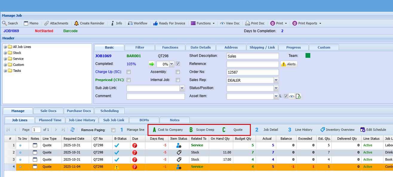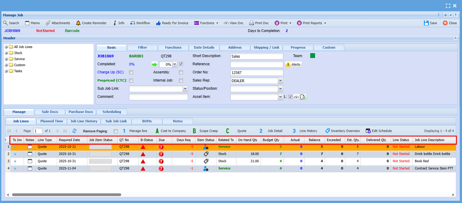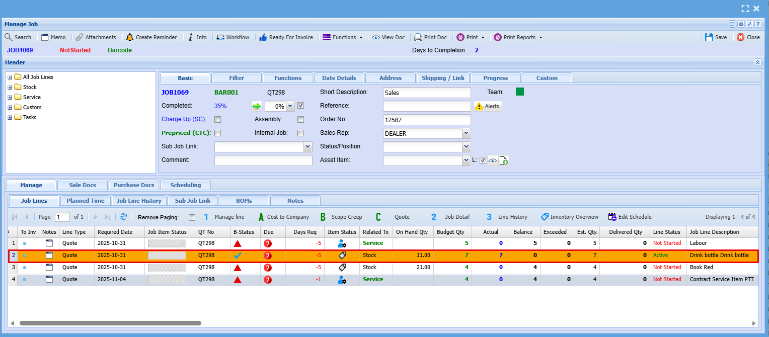 - BOM (Bill of Materials): Manage and update BOMs to reflect the materials required for each job line. This ensures production teams have clear visibility into what’s needed and when.