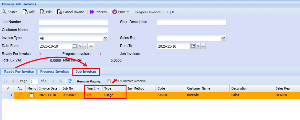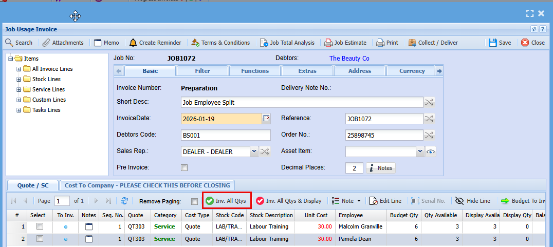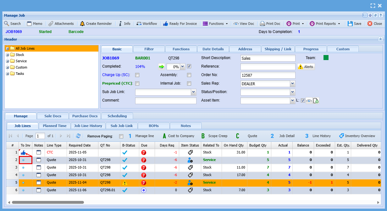 | To Invoice | You can click on the dot to change the icon to a thumbs up to send this line for invoicing |