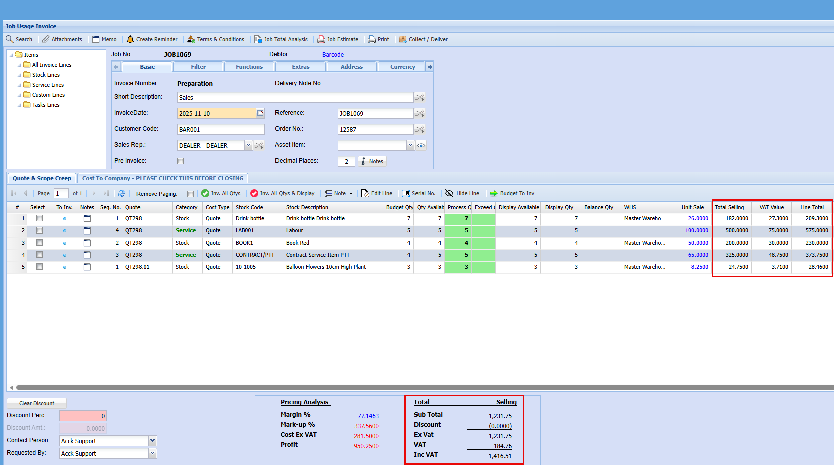 - You can compare quoted item costs and selling prices against actuals and invoiced amounts.