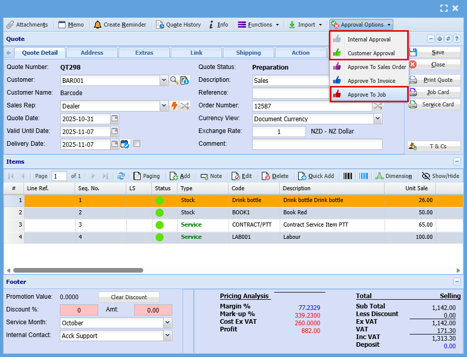 At the top of the quote, you'll find Approval Options. From here, you can either send the quote for internal approval before forwarding it to the customer, or send it directly to the customer. Once customer approval is received, use the same dropdown menu to promote the quote to a Job.