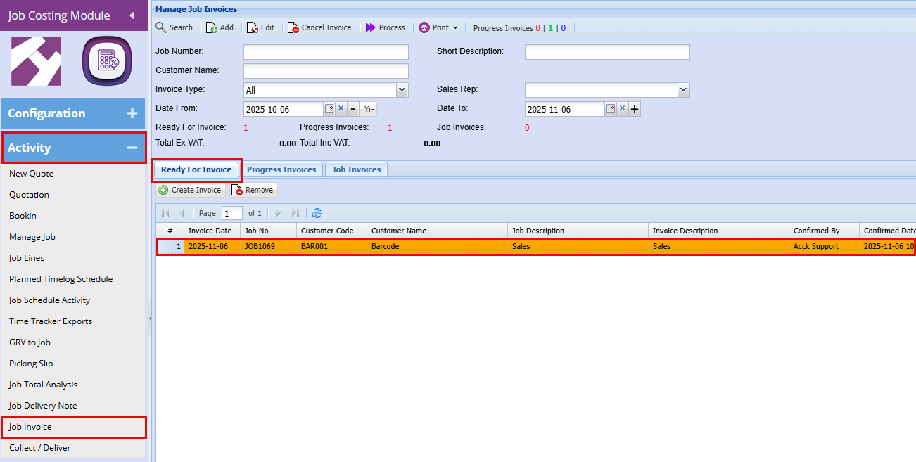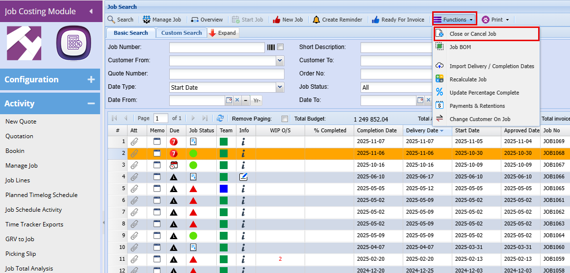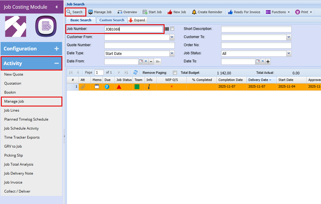 Job Costing > Activity > Manage Job