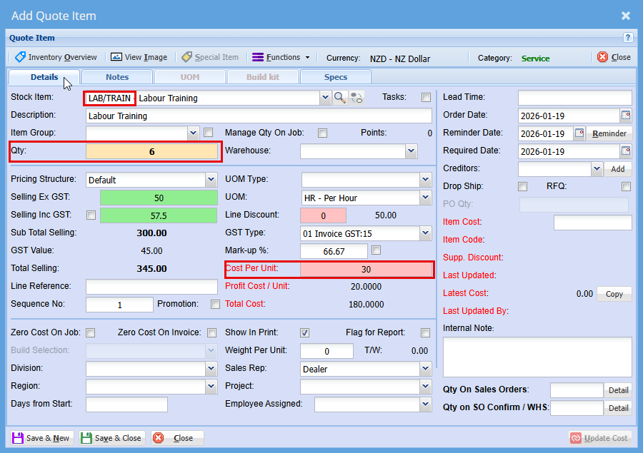 As with the Cost on job, these ticks will be automatically on or off based on the setup if the item. When the item is promoted to a Job, its initial cost is cleared and recalculated progressively as the job is built—ensuring you have an accurate final cost at completion. |