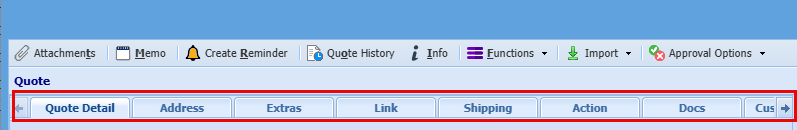 Before adding your line items to your quote, take a moment to review the key tabs across the top of your page, some of these tabs may contain important options you may want to configure or define first for a basic Quote.