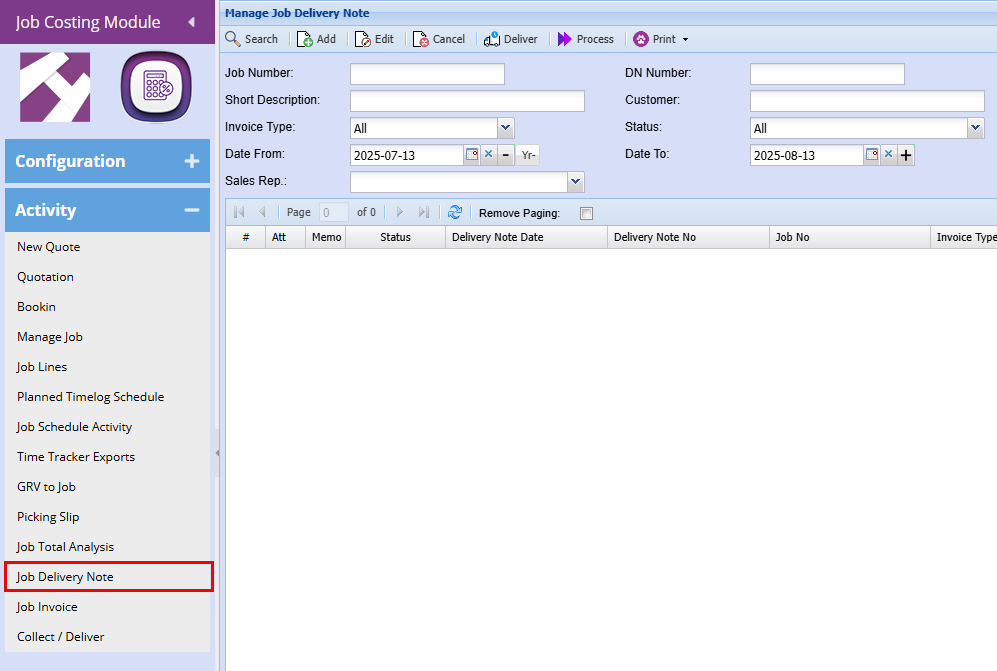 Job Costing Module > Activity > Job Delivery Note