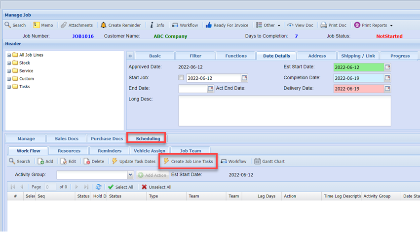 In the Manage job Scheduling, create job line tasks to add tasks from inventory lines linked to tasks
