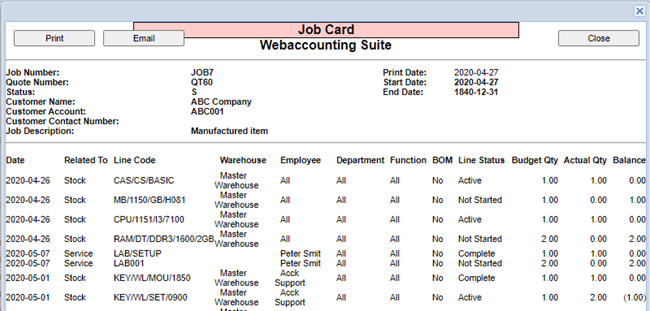 The Job Card will be printed to screen. You can then email, Print, etc.
