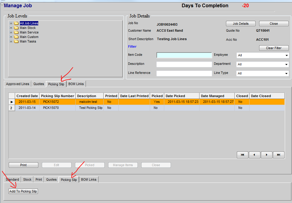 Go to Manage Job > Amend Job > Picking Slip Tab