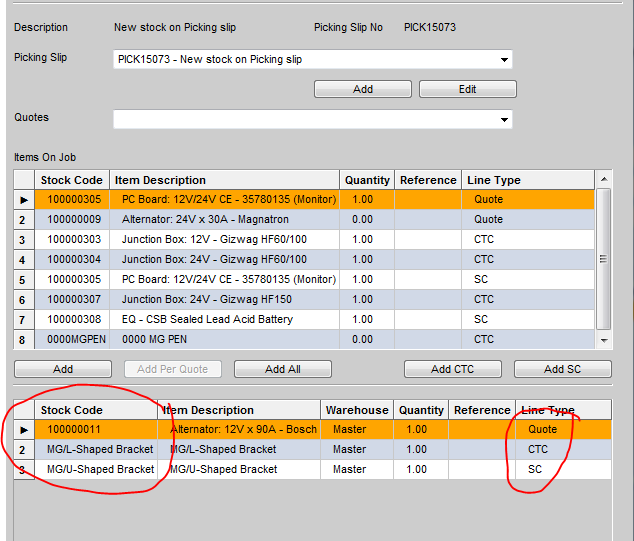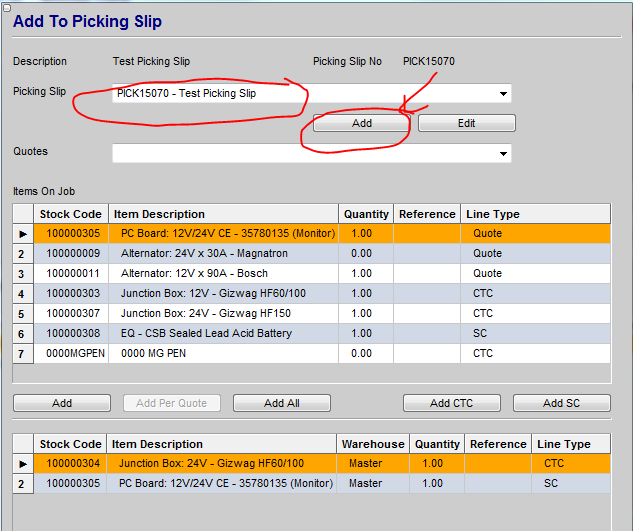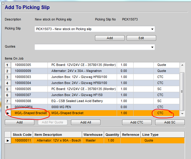 Now if you want to add new items onto the JOB and PICKING SLIP you can use the Add CTC button or Add SC button