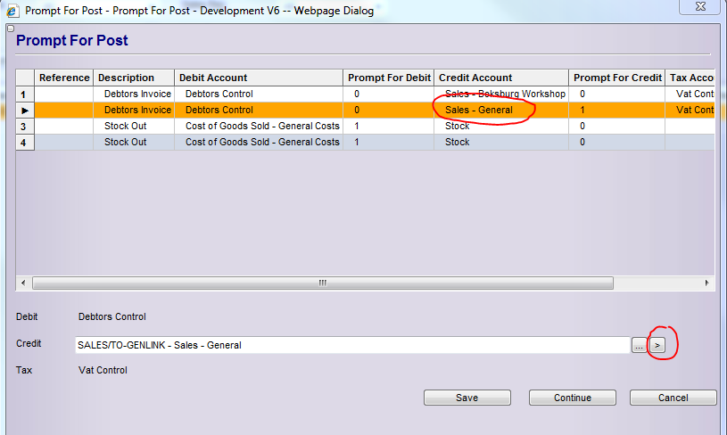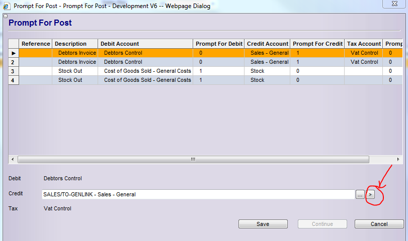 When the prompt for posting screen comes up and you want to change the ledger account that it posts to, click on the arrow button as shown below.
