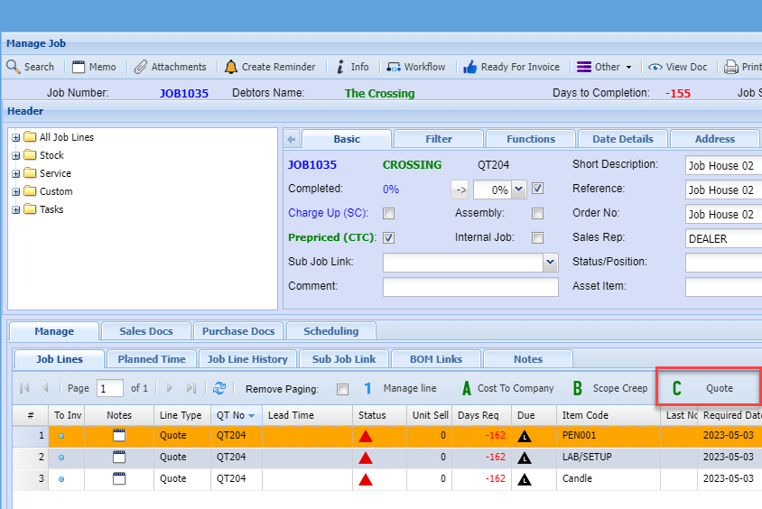 If you want a quote to be added within the job, then the quote would have had to be created within the job as a job quote (Option C). This creates a document number QT100.02 and then adds the quote to the job lines.