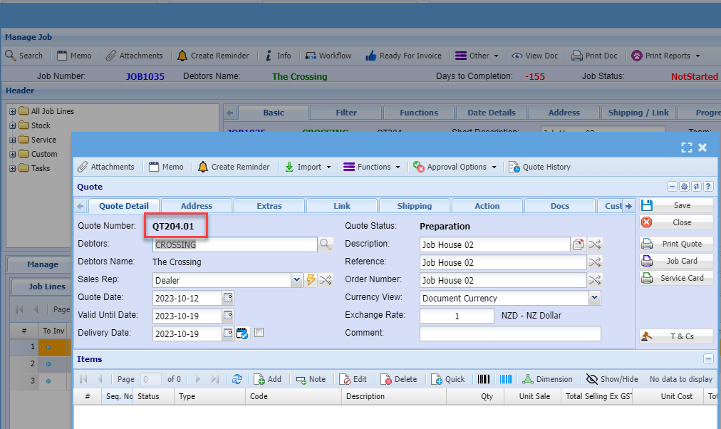 Creating a Quote to be added within the job