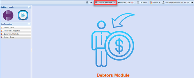 The number of messages for a user will be shown on the landing page. To access the messages, open any module in the system, right above, the messages notification will be displayed.