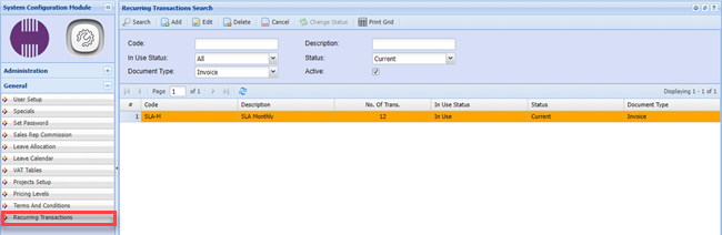 | In Use Status | When a Recurring Transaction Setup is used to generate a range of invoices then the In Use indicator flag is set to true. Therefor by selecting In Use for the search will result in all Recurring Transaction Setups that are in use being returned. |