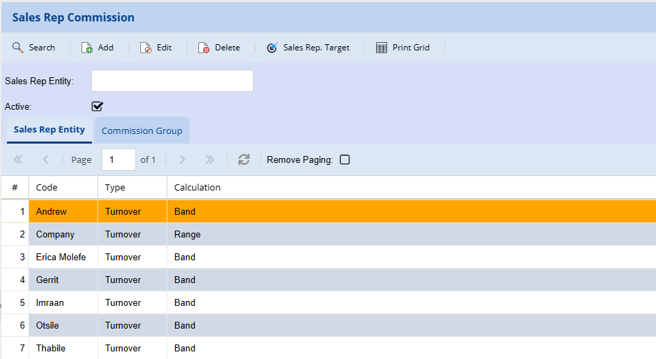| Code | The code can be either a sales rep name or a name, code or word to identify a group that will be receiving commission |