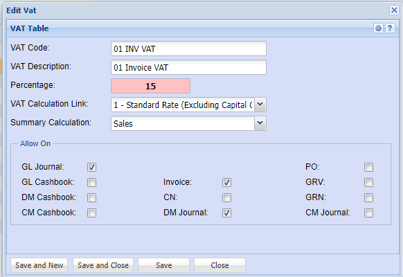 VAT Types - Upon the processing of documents, where vat is required, the drop-down menu will show the relevant VAT Type options.