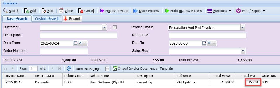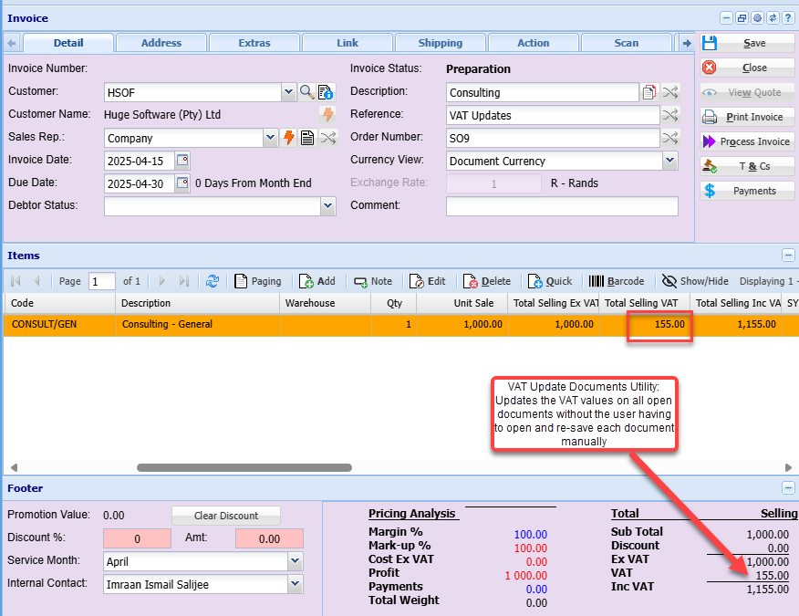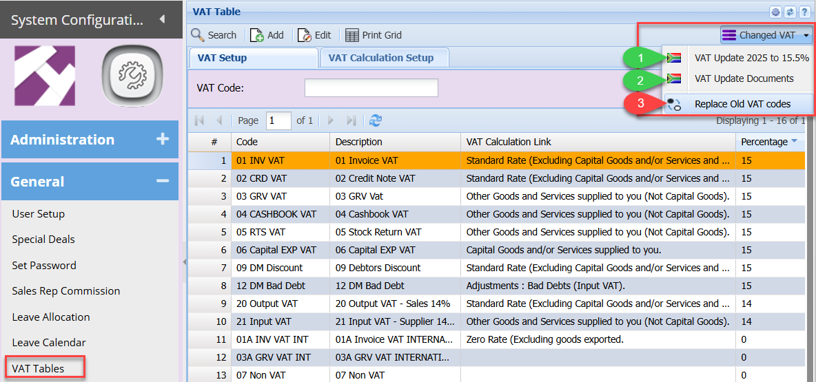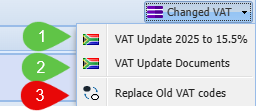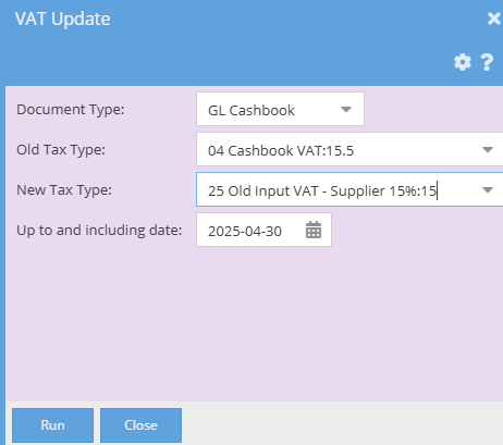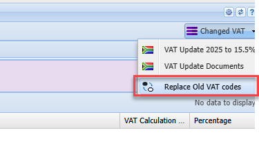 This will then find any open documents for the respective document type selected, dated on or before the 30 April 2025, example Cashbook and change the VAT Type and the VAT rate to the15% rate.