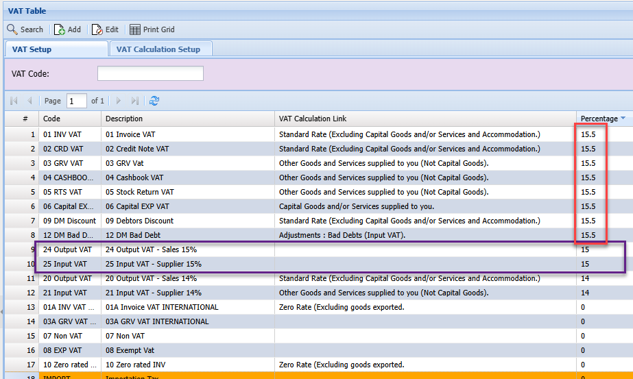 - All the VAT rates on the existing VAT Types have been updated to 15.5%