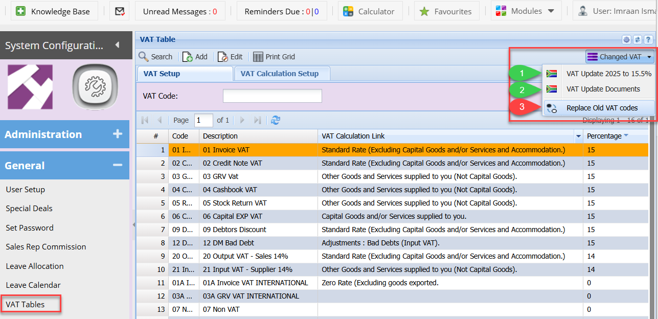 This will then find any open documents for the respective document type selected, dated on or before the 30 April 2025, example Cashbook and change the VAT Type and the VAT rate to the15% rate.