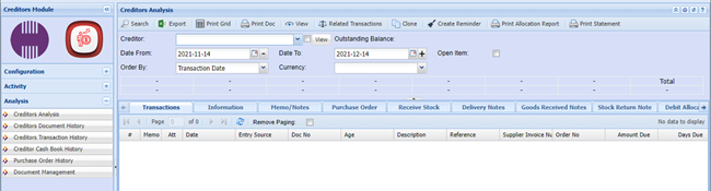 | Related Transactions | Shows the related transactions for the selected creditors analysis |