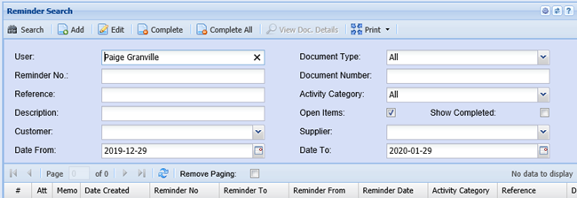 Show Completed – if the box is ticked, then the system searches only completed reminders