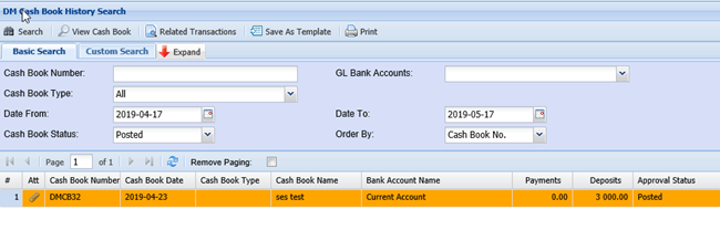 This allows a user to search for Cashbook documents created.