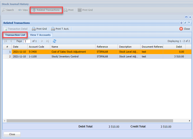 The adjustment journals being Stock Value Adjustment Journal and the Stock Level Adjustment