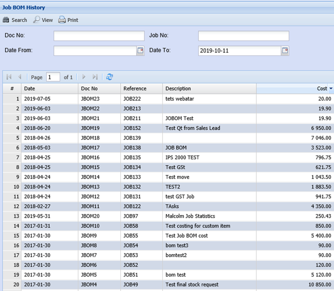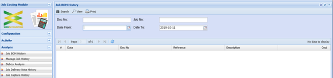 Job Costing> Analysis > Job Bom History