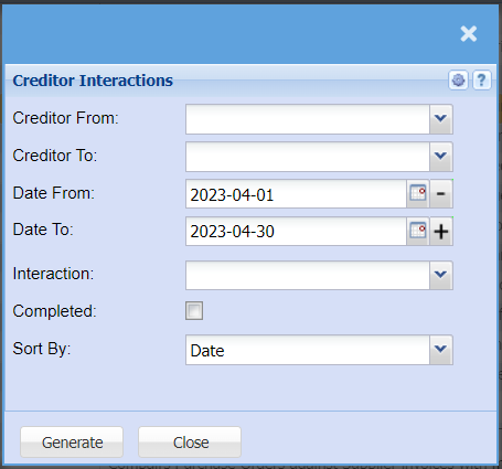 This report shows all notes captured against creditors. A single Creditor can be selected to view all notes captured.