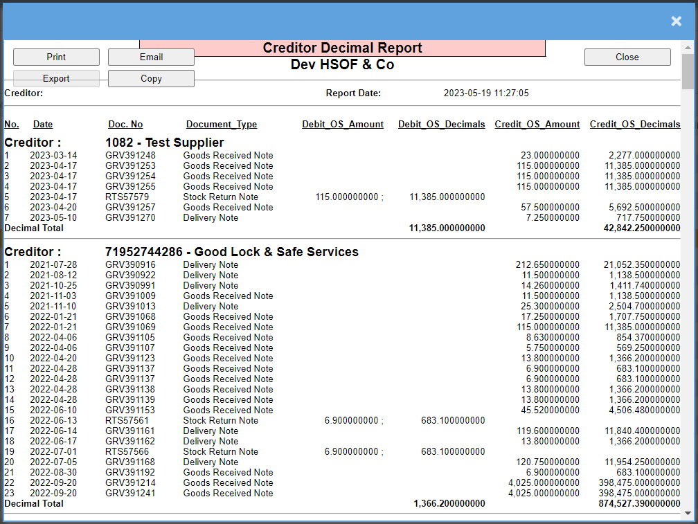 This report works out any Creditors that have decimal values outstanding on debit and credit values