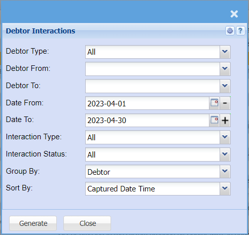 | Group By | group the report by selection either a debtor or contact person or interaction |