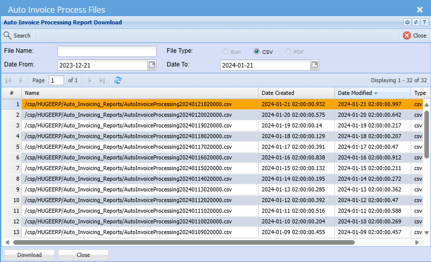 Download a report log of automatic invoices processed by system each night