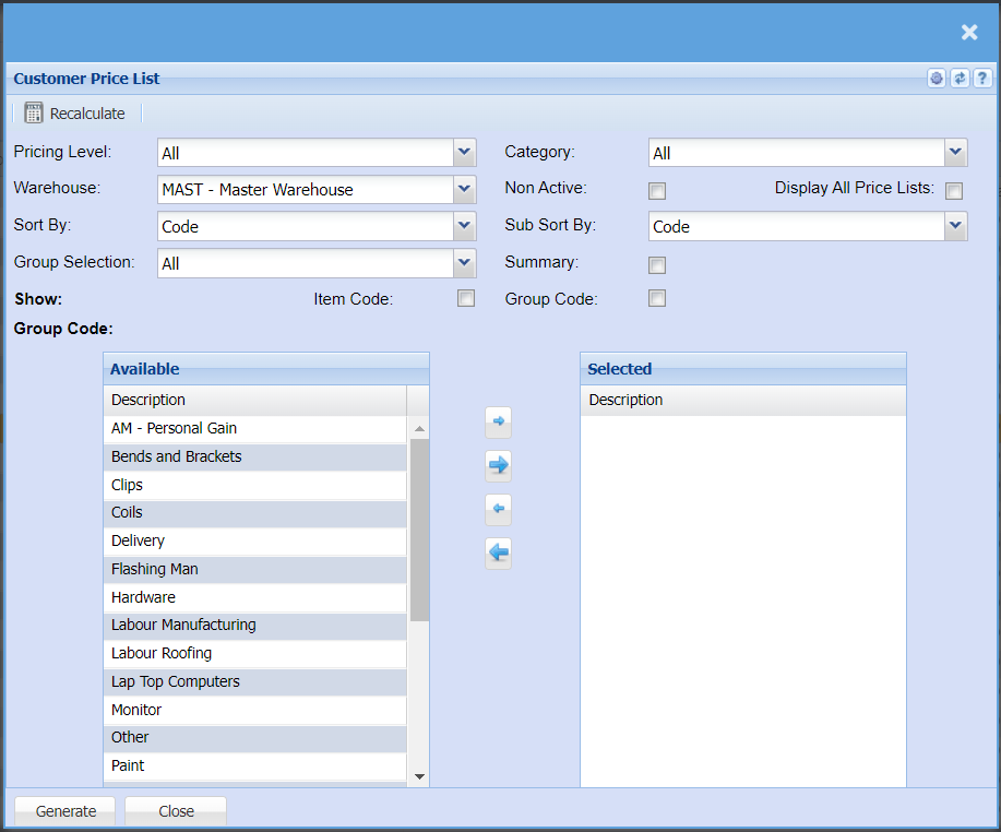 Customer Price List