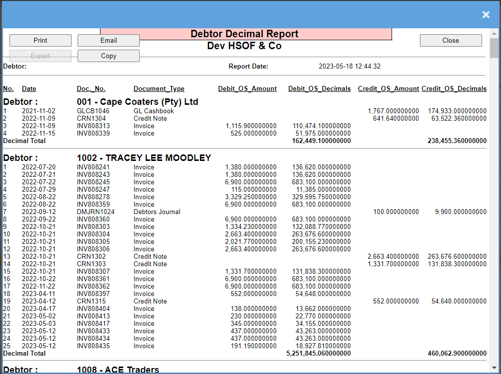 This report works out any debtors that have decimal values outstanding on debit and credit values.
