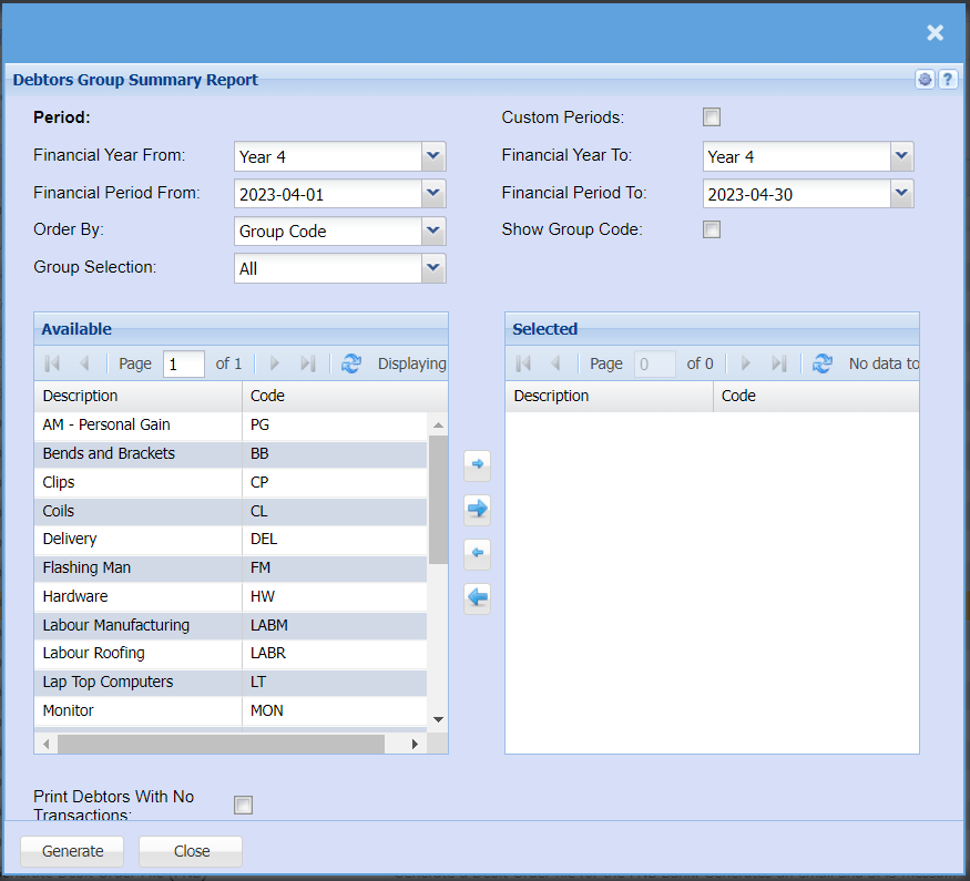 | Print Debtors With No Transactions Tick | By ticking this box all your debtors who do not have any transactions for the time period you are pulling the report for will still be pulled for the report |