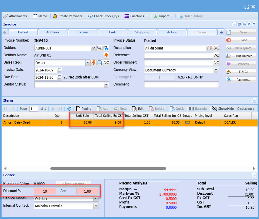 If we take a line item that costs 10.00 and give and overall discount of 10%, the net effect of the line is 9.00 .