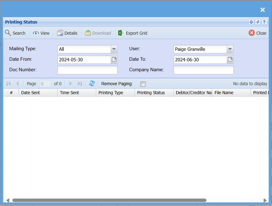 Status opens up the printing status window so you can see the whether the statement was sent successfully.