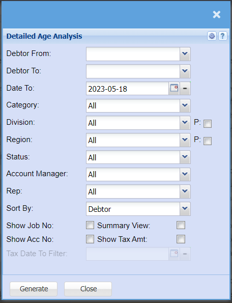 | Debtor From / Debtor To | Select a Customer/Debtor you wish to view the report from. Select the Customer/Debtor you wish to see up to in the report. |