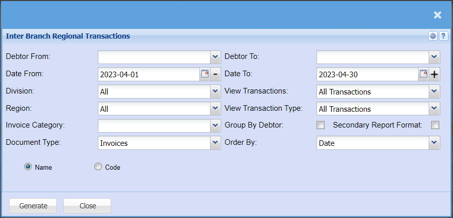 | Division | If you have set up divisions for your debtors, you can pull the report for all your debtors or you can select a specific Division from the drop-down menu. |
