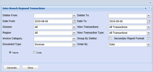 Inter Branch Transactions shows inter branch credit notes and invoices filtered by user region, transaction source and branch transactions.