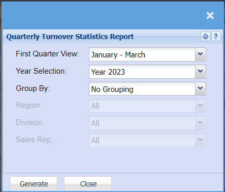 Quarterly turnover statistics report grouped by either Region, Division or Sales Rep