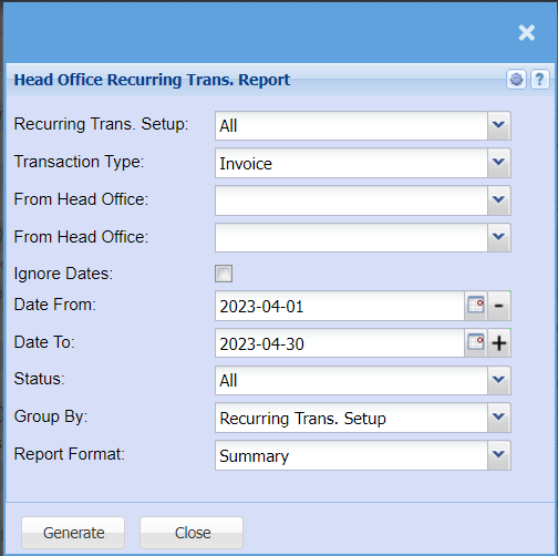 | Recurring Trans. Setup | Select all or specific recurring transactions from the dropdown menu. |
